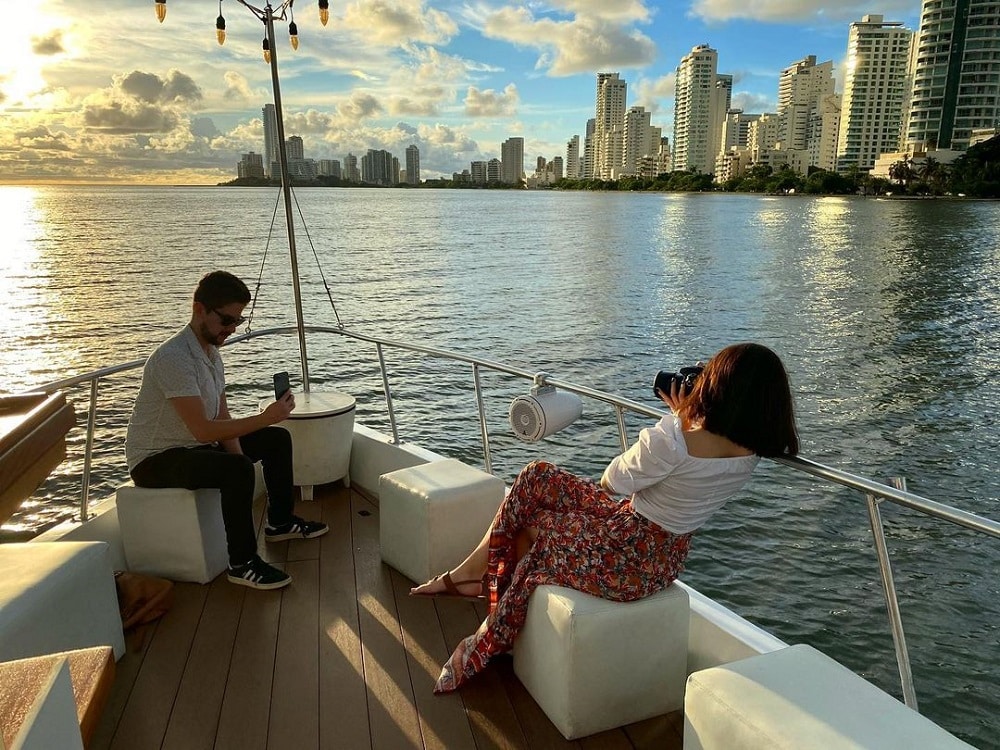 Durante este recorrido, navegamos frente al imponente skyline de Bocagrande, el Centro Histórico y los fuertes coloniales mientras el cielo se tiñe de tonos dorados, naranjas y rosados. Esta experiencia es perfecta para parejas, familias, grupos de amigos o viajeros que desean vivir un momento mágico en el Caribe.